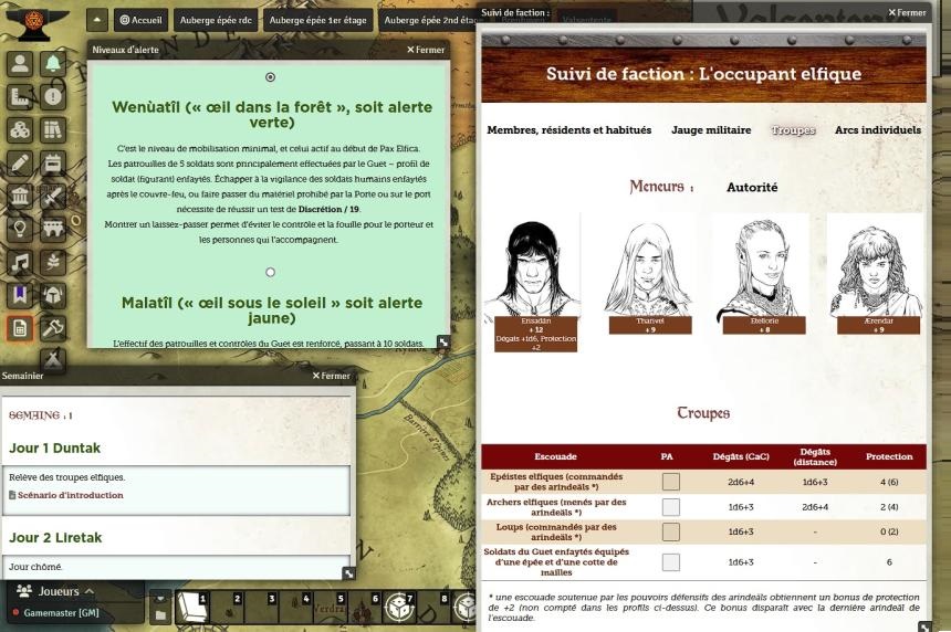 - Les formulaires de suivi des paramètres et évènements de la campagne (semainier, niveau d'alerte, suspicion envers les PJ, factions, arcs narratifs) intégrés