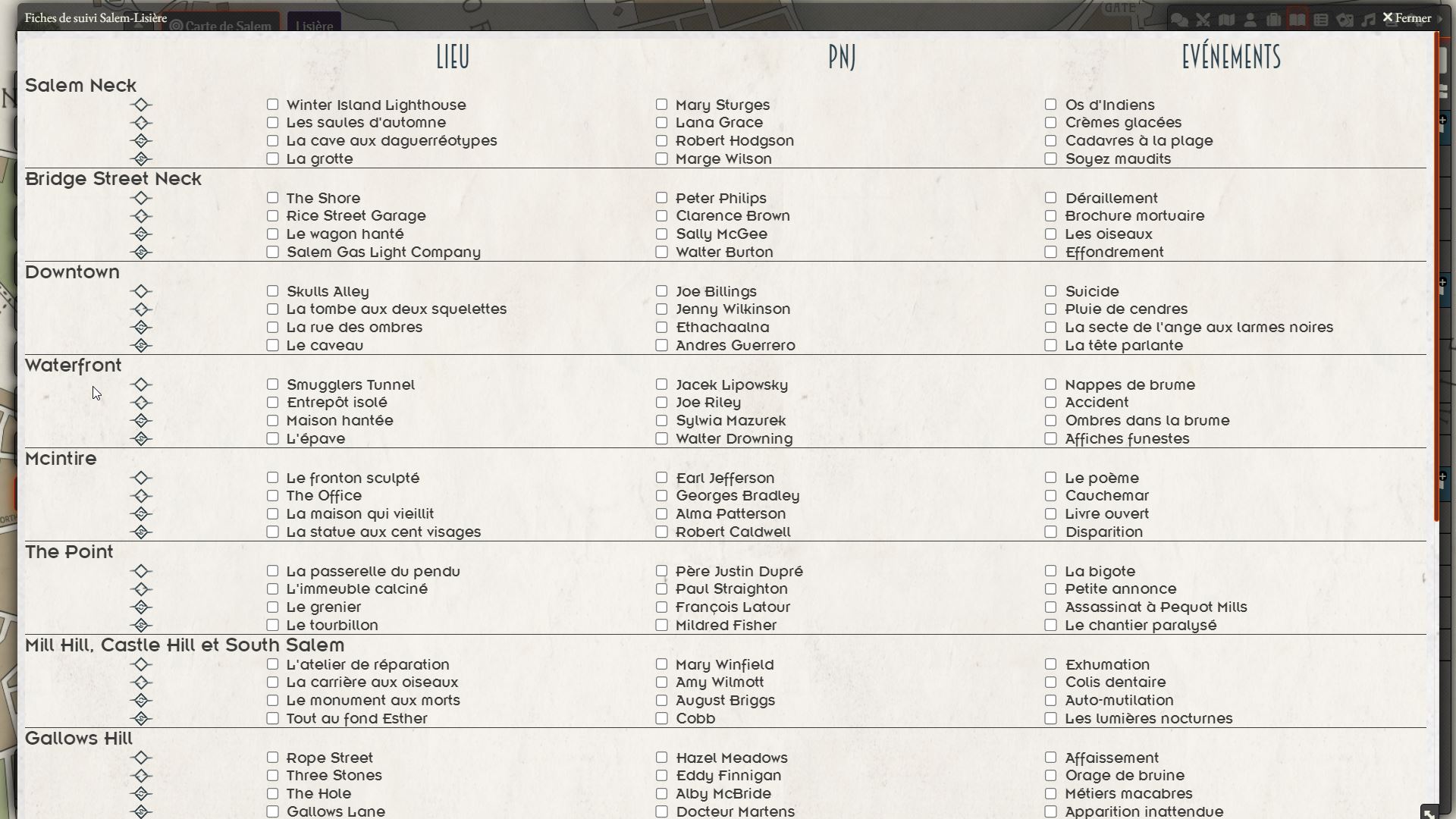 Le tout est accompagné des fiches de personnages prétirés, de toutes les aides de jeu, des portraits et jetons des PNJ de la campagne et de la ville de Salem, de plans grand format de la ville, et d'un guide touristique à destination des joueurs.