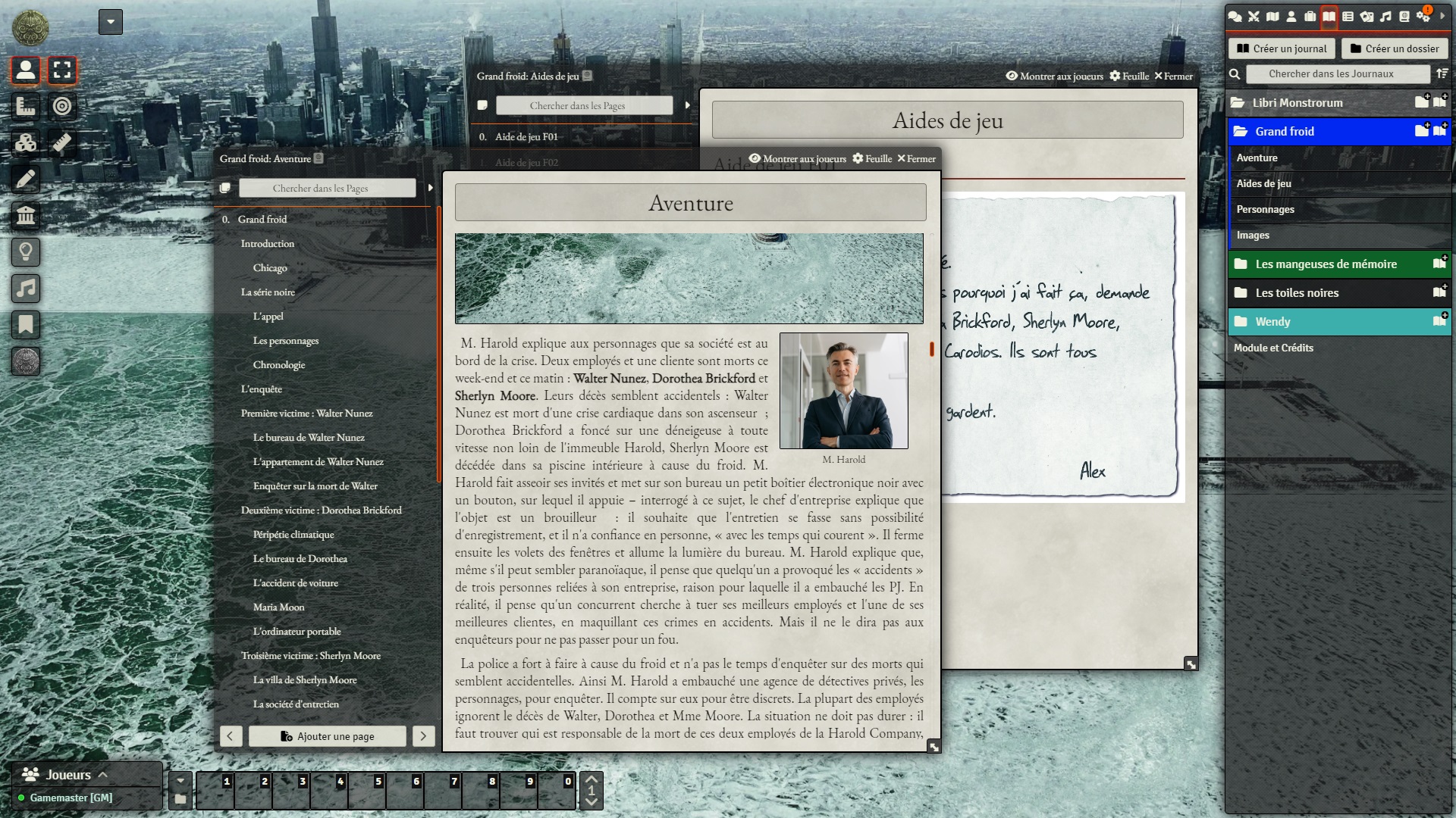 - Grand Froid est une aventure contemporaine qui propose aux PJs d'enquêter sur le décès accidentel de trois personnes liées à la Harold Company (personnages prétirés inclus).