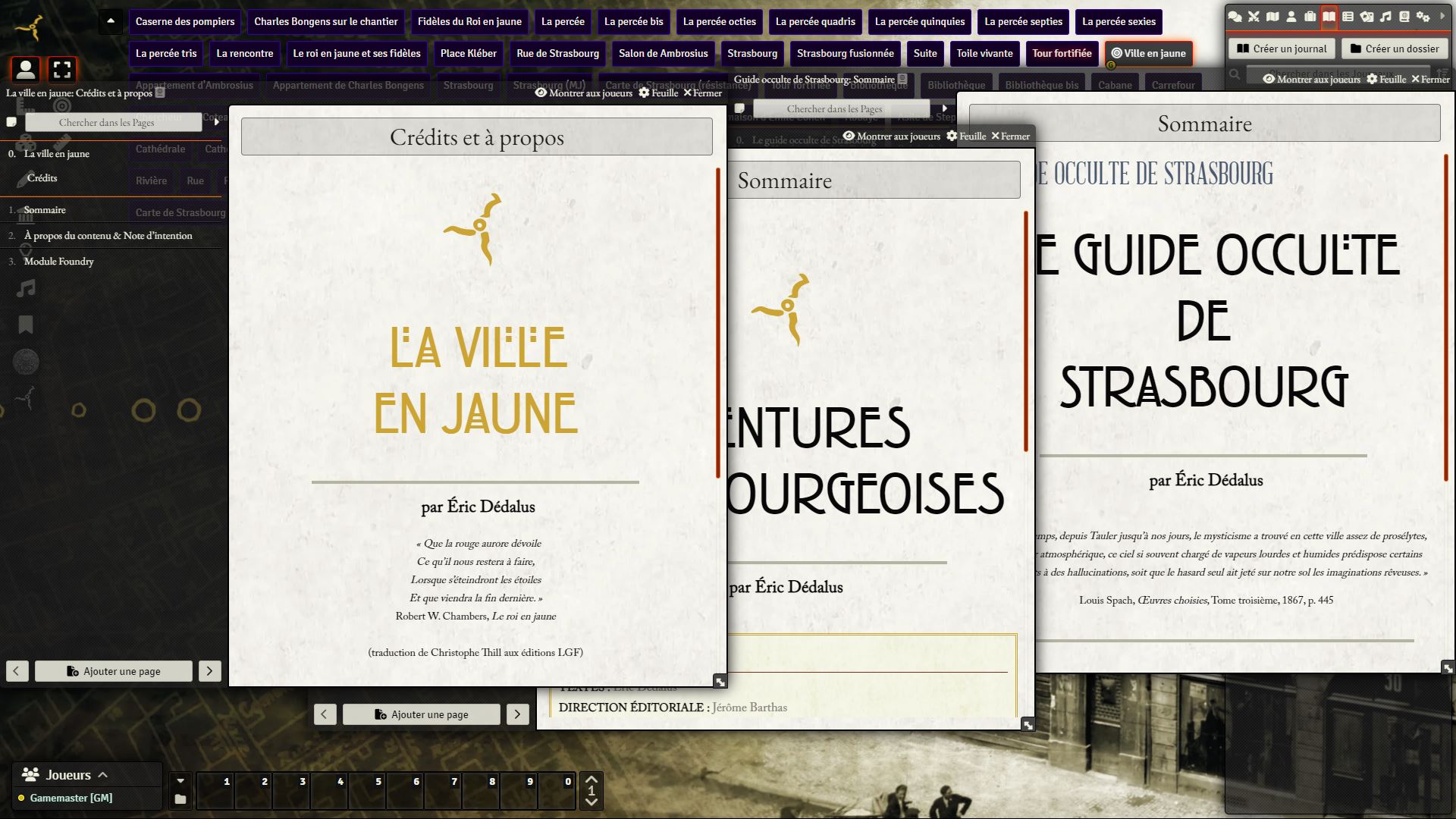 La Ville en Jaune est une campagne pour Cthulhu Hack VF. Elle se déroule à Strasbourg dans les année 1920 et a pour décor le projet d’urbanisme de la Grande Percée et deux cultes rivaux qui tentent de faire surgir Carcosa au coeur de Strasbourg. La campagne est constituée de trois actes :