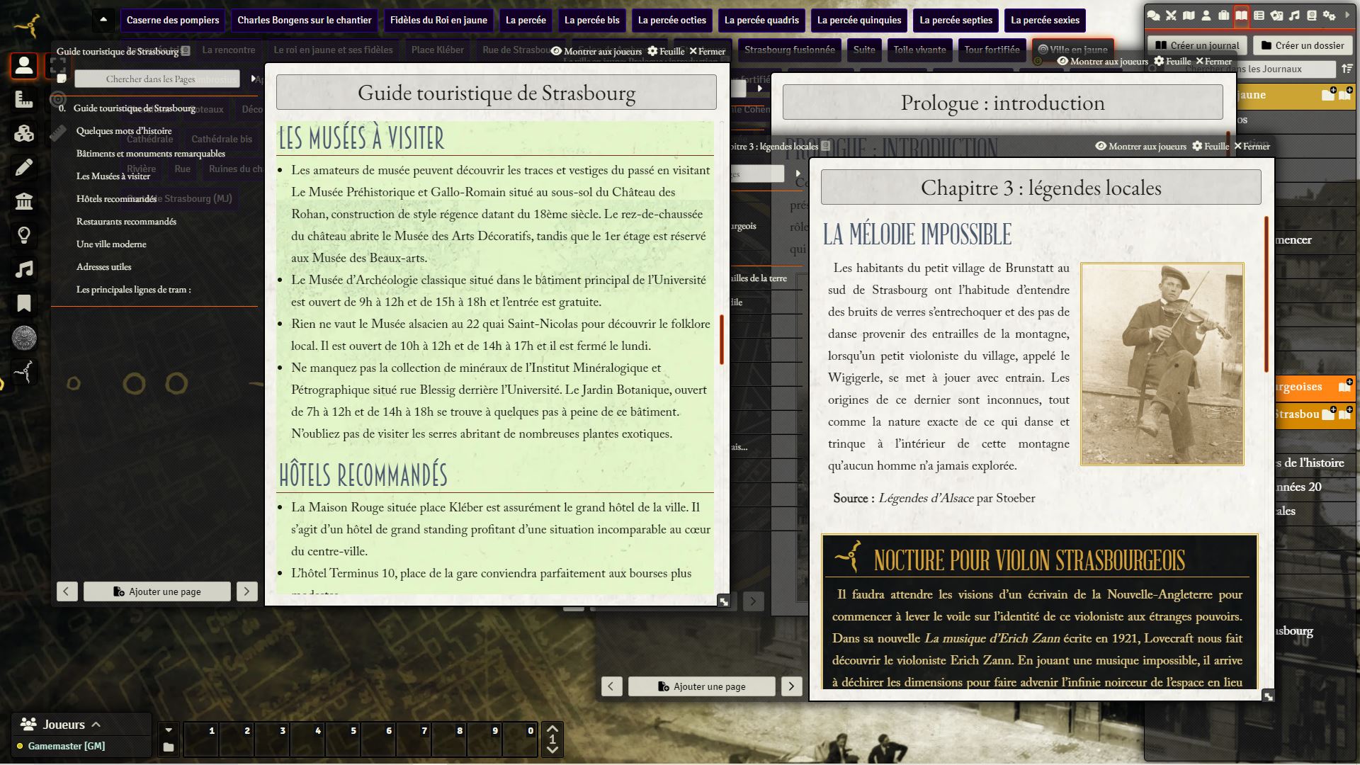 - 31 journaux contenant l'intégralité de la campagne Ville en Jaune, des scénarios d' Aventures strasbourgeoises, ainsi que le Guide occulte de Strasbourg et le livret Guide touristique de Strasbourg.
