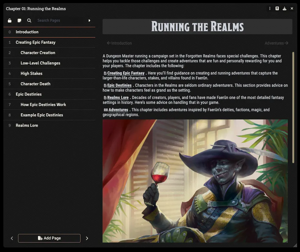 All the details of the source book are available right at your fingertips using a custom compendium app and Journal sheet which presents the content in a distinctive style that matches the look and feel of the physical book in Foundry.