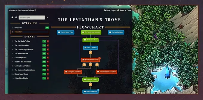As a Gamemaster you can also create sprawling non-linear quests with branching choices and consequences or standalone events for one-off gameplay moments, encounters, or sessions! Associate each event with locations in the world, area maps for combat encounters, or created vista compositions.