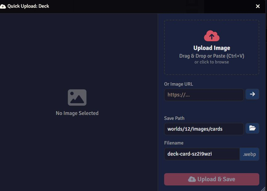 Quick Upload is a Foundry VTT module that speeds up image updates for documents. It supports drag & drop, clipboard paste, and URL import, includes a built-in image editor, and converts images to WebP automatically.