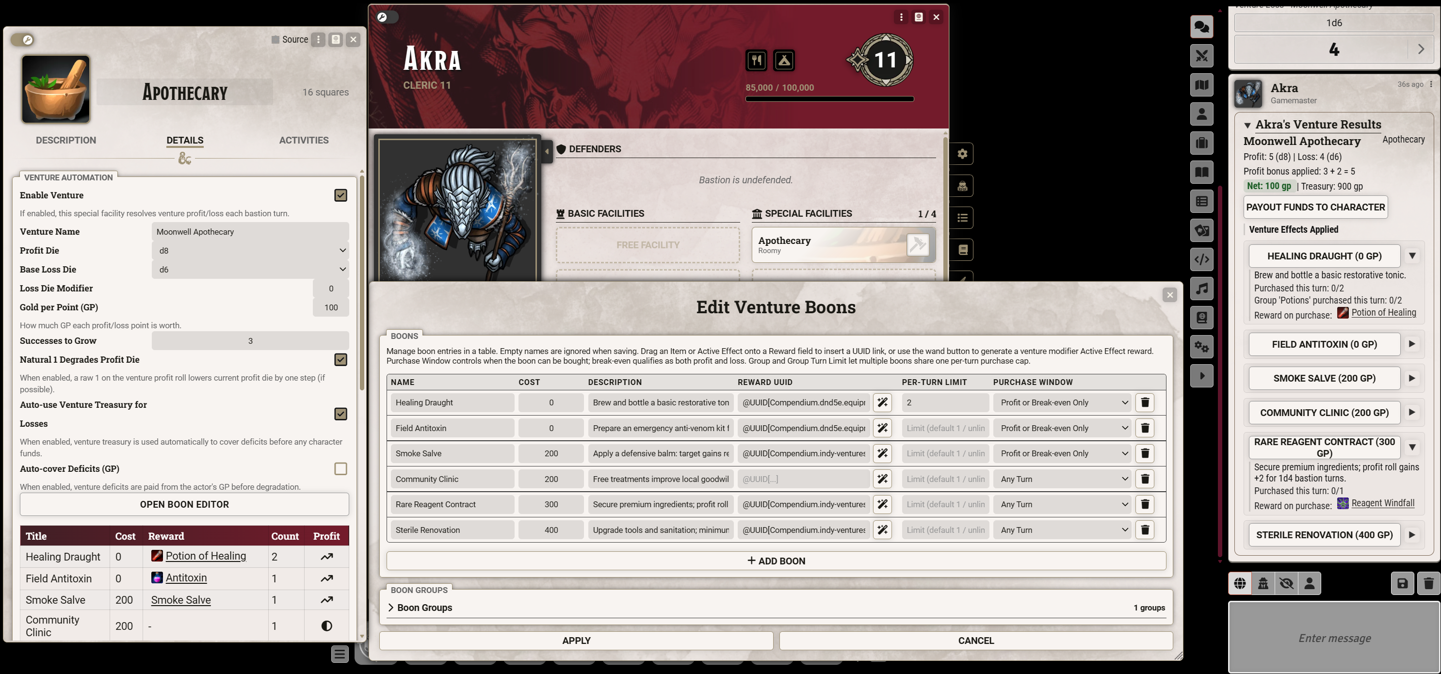 Indy Ventures adds venture automation to D&D5e bastions. Spice up your bastions with customizable projects and rewards. Run a tavern, organize a cult, open an apothecary - tally your profits and spend them on improvements/items/active effects.