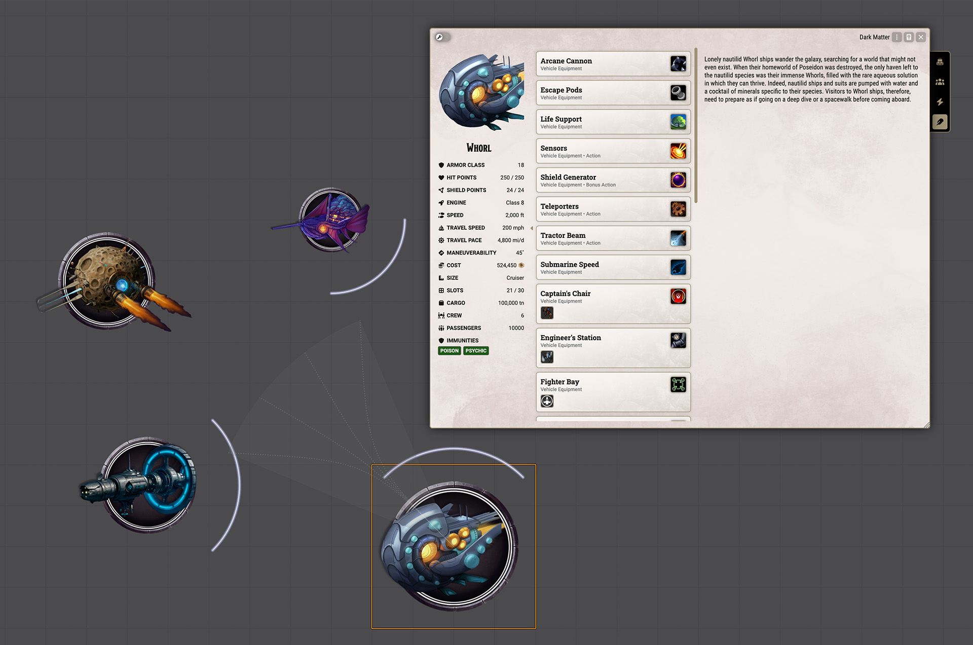 Brand new sheets for ships and battleframes along with enhancements to the game canvas make space battles a breeze in the Dark Matter module.