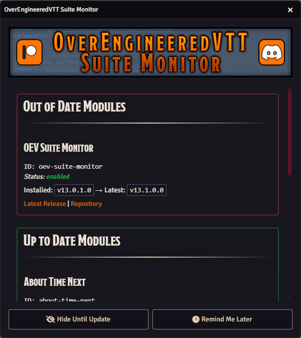A suite monitor for OverEngineeredVTT module updates and reminders. This module is a dependancy of all other OverEngineeredVTT modules and will be installed automatically when installing any OEV module.