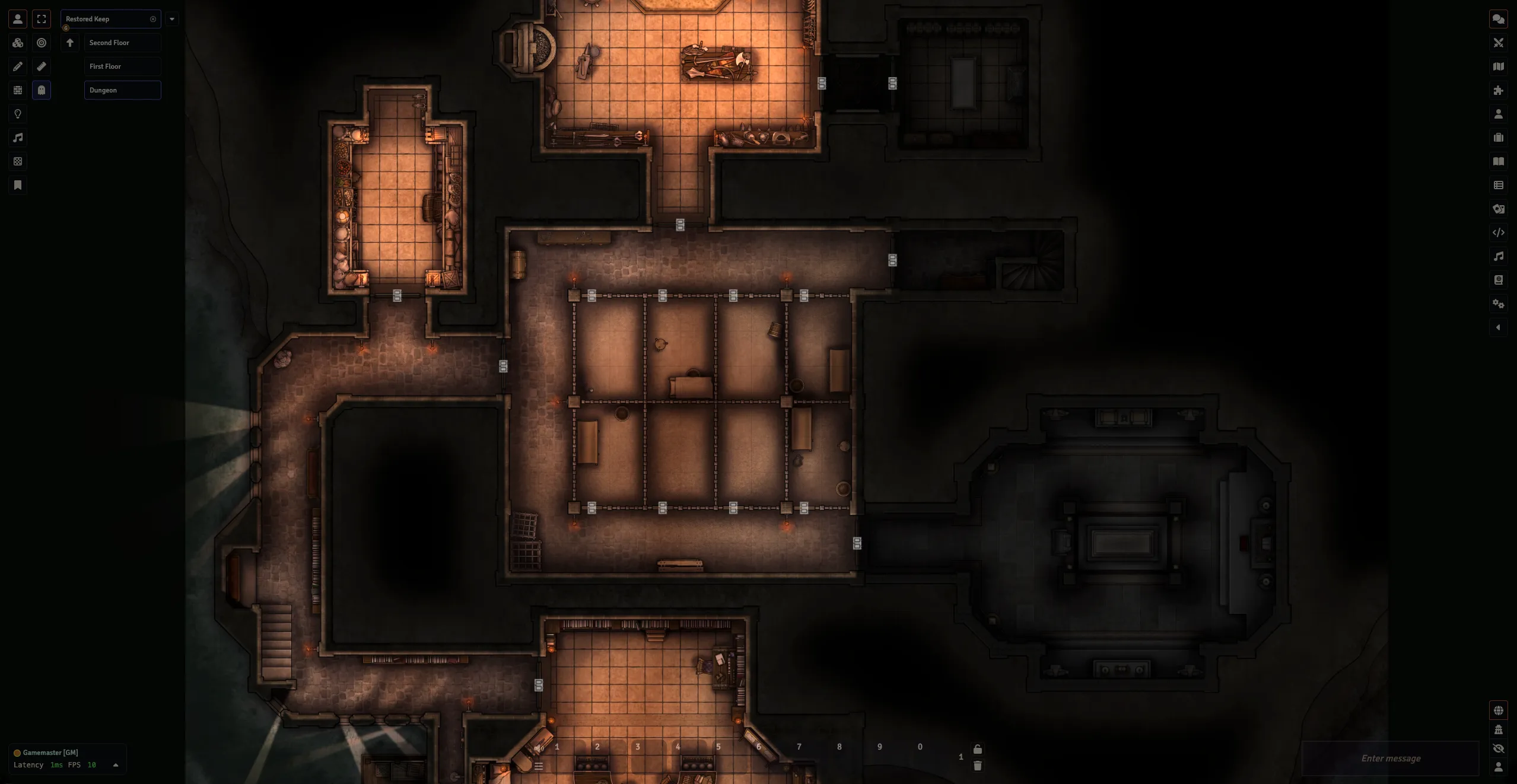 Explore all four levels of the Restored Keep from a dungeon level with access to the water up to the third floor with visibility over the lower levels including tokens, tiles, lights, and walls. The scene is also configured with animated doors, the new Change Level region behavior, and the Define Surface region behavior for defining what areas of the Scene shouldn't be visible from different heights.