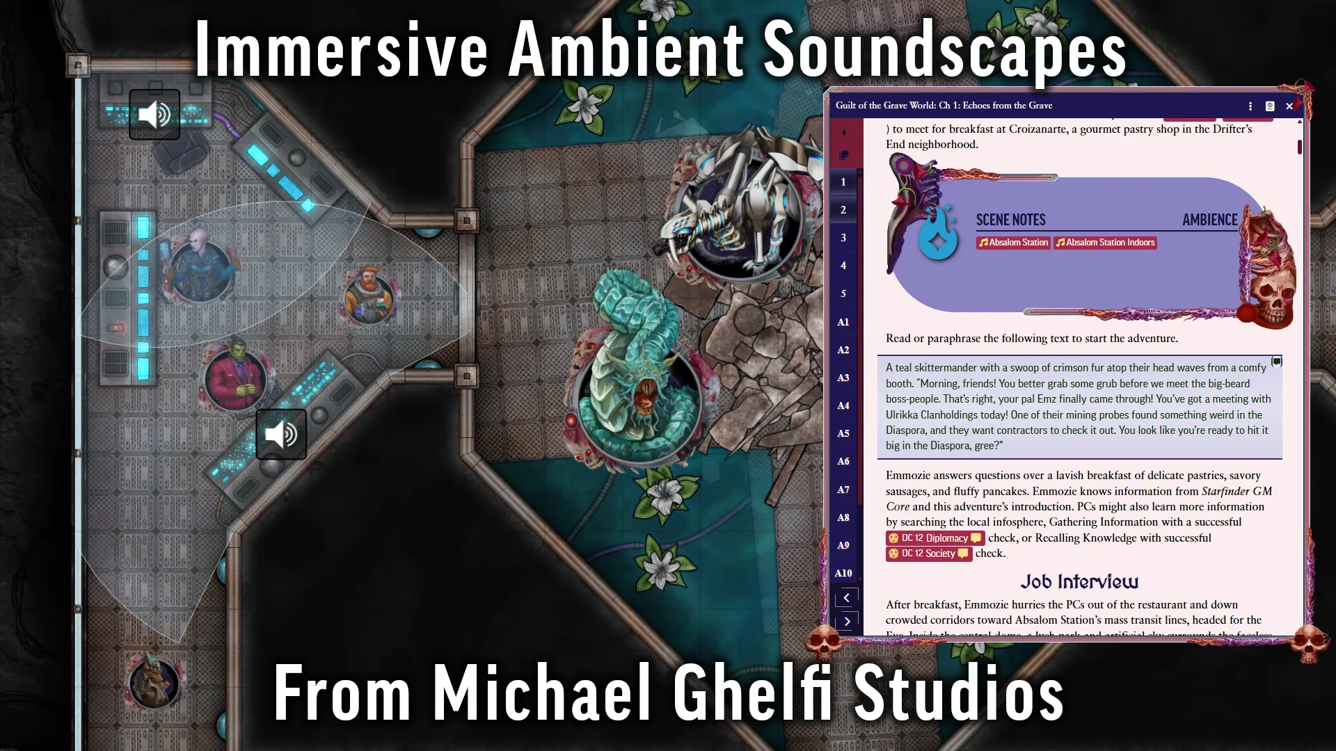 - Soundscapes by Michael Ghelfi Studios provided as ambient playlists and local sound sources to immerse your players.