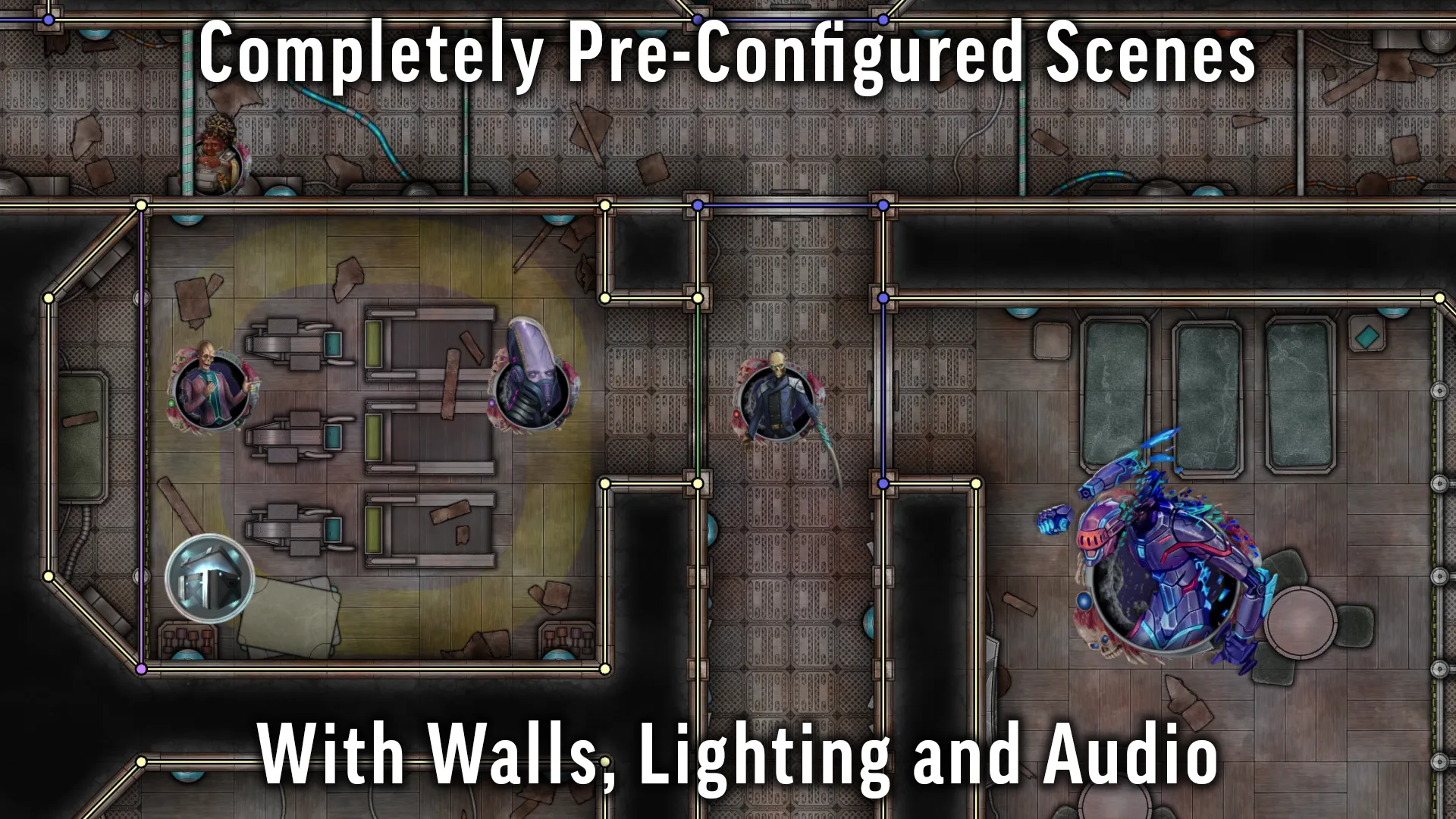 - Scenes pre-configured with walls, animated doors, lights, sound, tokens, and hazards already placed to provide GMs the most convenient experience running the adventure.