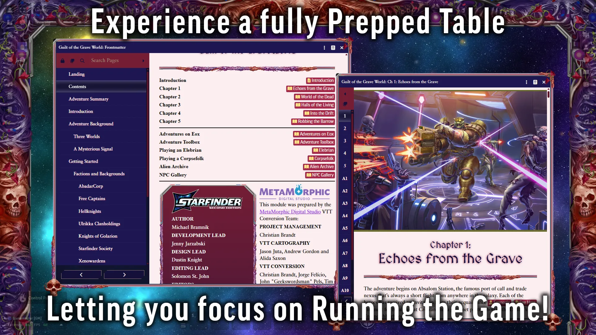 Guilt of the Grave World is a full space opera campaign spanning levels 1 to 5, with roughly one level of epic adventure content in each of its five parts. Featuring themes of exploration, horror, and wacky pop culture, it’s the perfect entry point to the galaxy of Starfinder Second Edition. Experience this adventure using the full suite of Foundry VTT features, using maps, tiles, tokens, sounds, and much more to bring you content which truly cannot be experienced in the same way anywhere else!