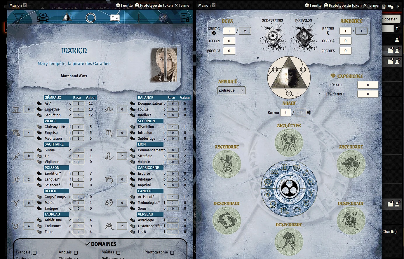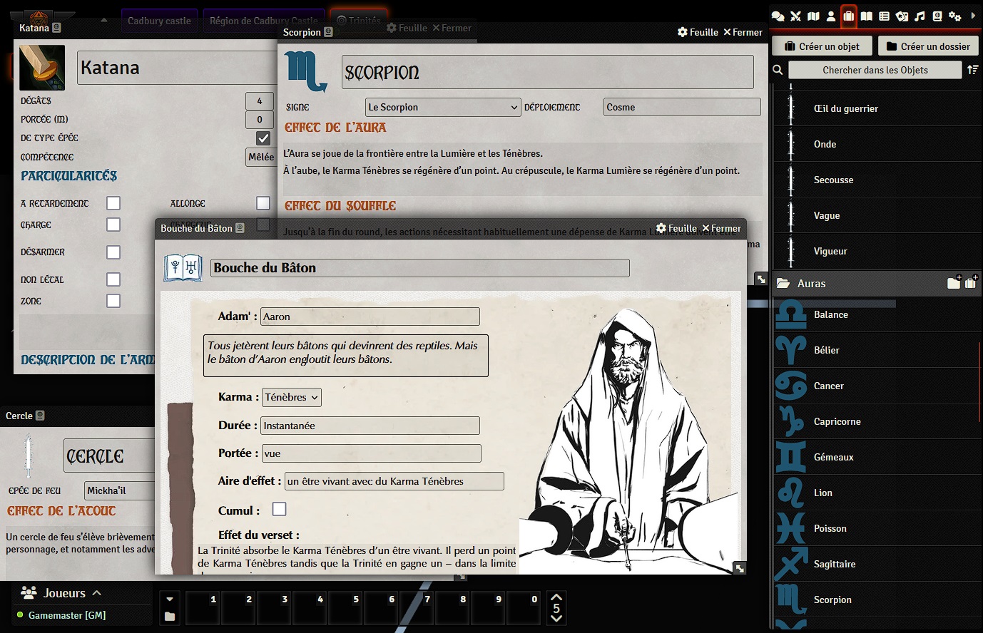 Ce module doit être utilisé avec le système Trinités et ne fonctionne qu'à partir de la version 10 de Foundry VTT. Il contient :