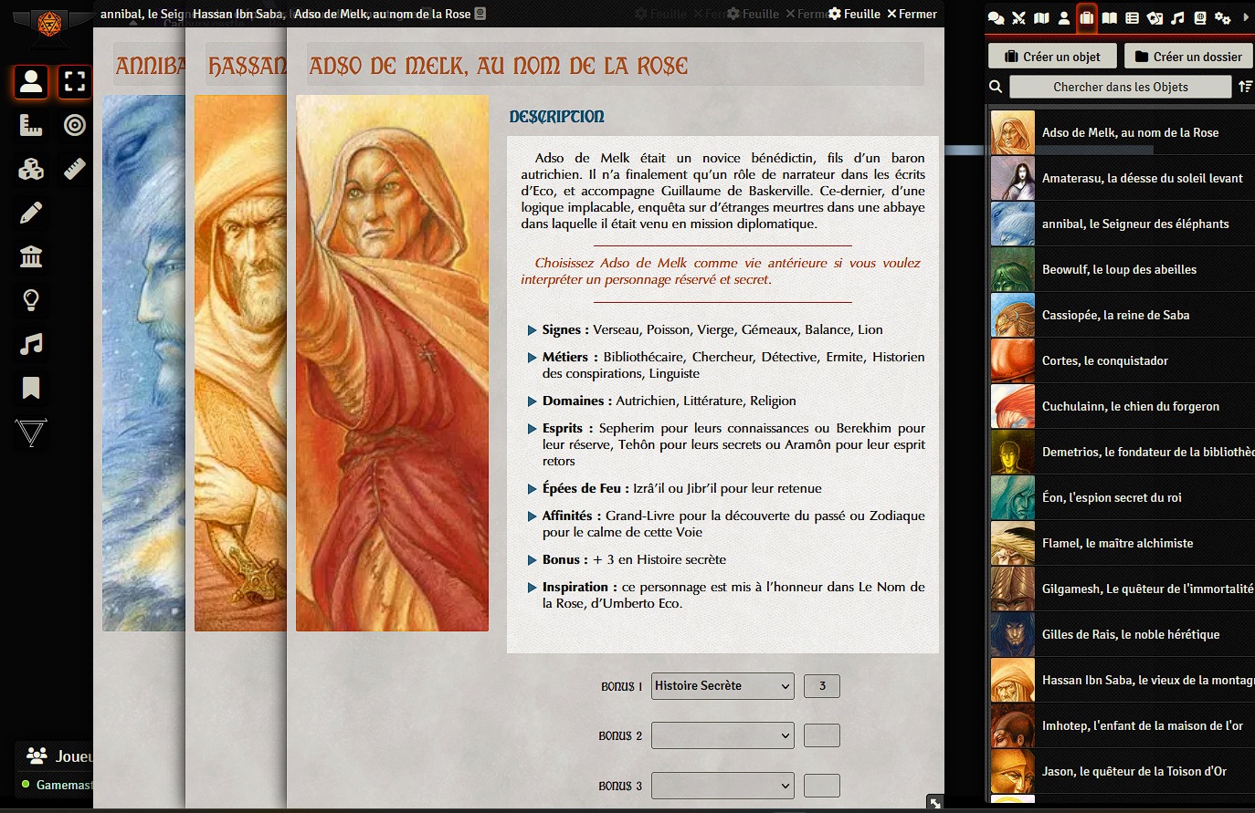 - 32 acteurs référençant les PNJ des deux ouvrages et du scénario.
