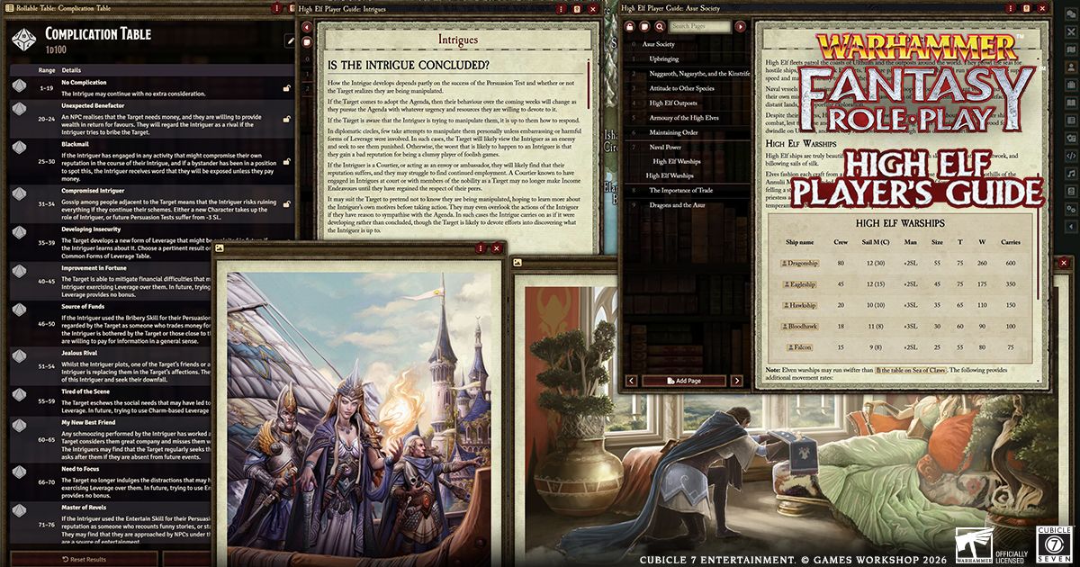 - A system for designing and managing intrigues in the kingdoms of Ulthuan, allowing Characters to influence the decisions of important NPCs whilst keeping their intentions plausibly deniable.